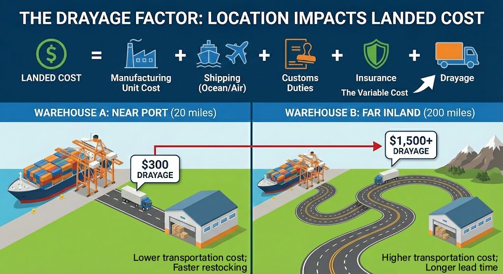 Once you know where your customers are, you need to determine how efficiently you can get goods to the warehouse. Recent supply chain disruptions have taught us that relying on a facility 500 miles from the nearest port adds significant lead time and expensive “drayage” (trucking fees) to every shipment. This remains especially relevant in 2026 as drayage rates continue trending upward across major global ports.