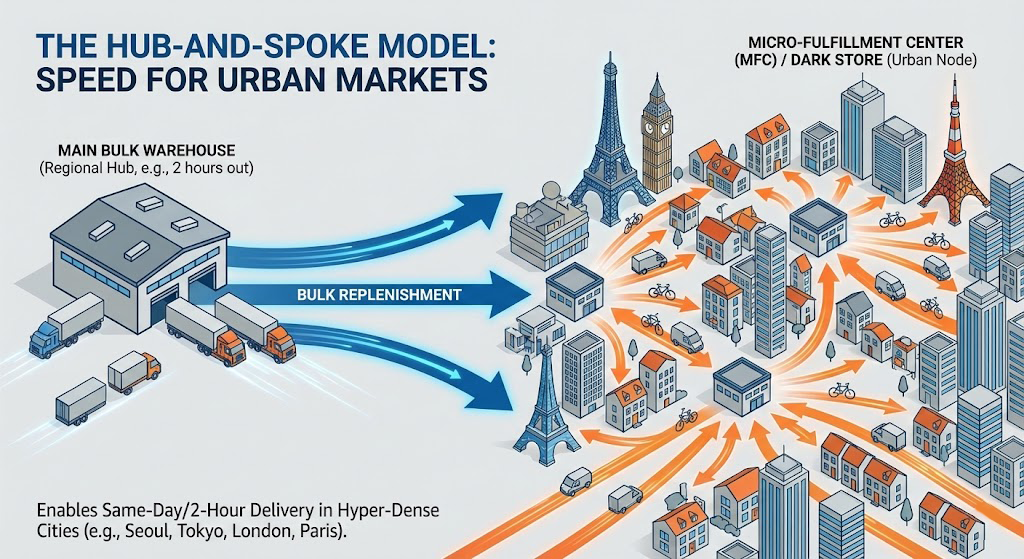 This is driving the trend toward urban “micro-fulfillment centers” (MFCs) or dark stores located inside city limits. These small hubs hold fast-moving SKUs and enable same-day or even 2-hour delivery via bike or van couriers, bypassing traditional carrier networks. Brands operating in hyper-dense cities like Seoul, Tokyo, London, and Paris are increasingly using a “hub-and-spoke” model—a main warehouse for bulk storage that feeds smaller urban nodes for lightning-fast local delivery.