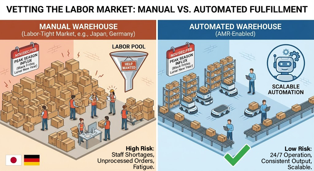 In labor-tight markets like Japan or Germany, highly automated warehouses utilizing autonomous mobile robots (AMRs) are often a safer bet than manual ones. They don’t get tired, and they aren’t subject to labor shortages. Always ask a potential partner: How do you scale your workforce during peak season? This question becomes even more important in 2026 as labor shortages persist across both developed and emerging markets.